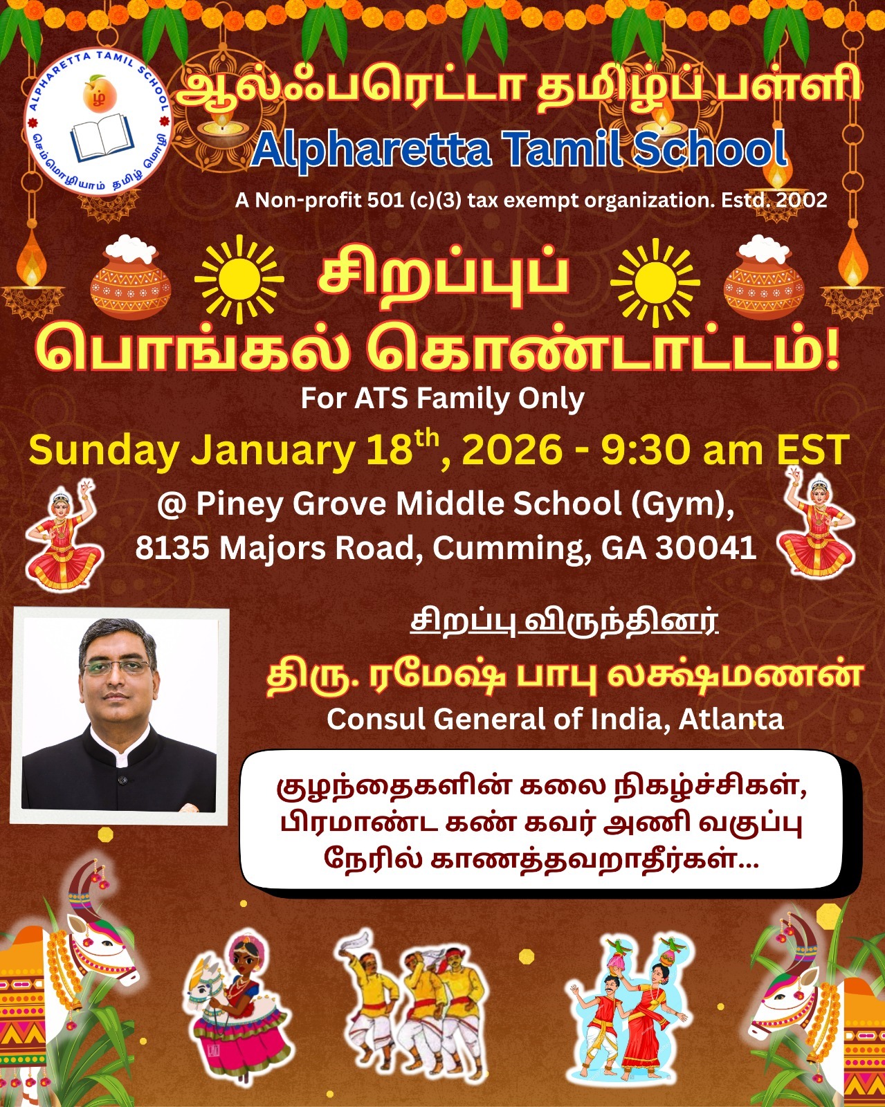 Please save the date for our upcoming ATS Pongal celebration! This event offers our students a wonderful opportunity to learn about Pongal celebration while experiencing